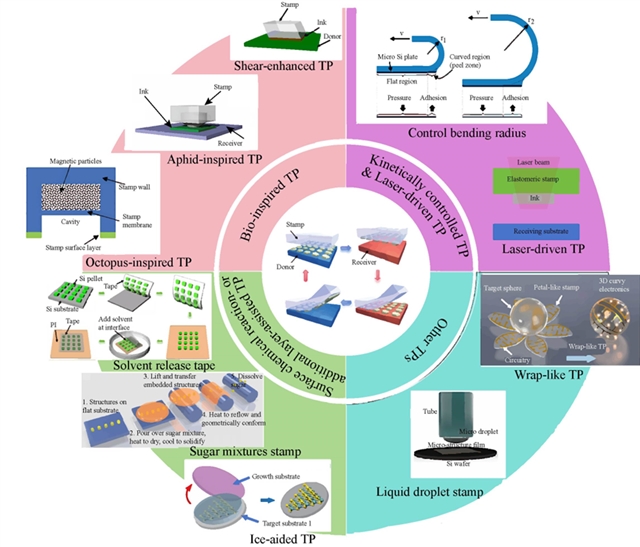 文章详细分类并对比了多种转印技术,其核心在于通过不同物理机制调控印章与器件间的粘附力,粘附切换比是衡量其性能的关键参数之一。