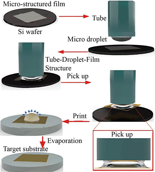 图3:利用液滴印章将半导体薄膜转印到目标衬底的过程。图源:Advanced Functional Materials 31, (2021).