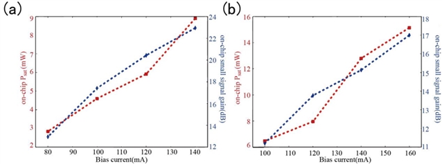 图4:转印后SOA的性能。(a)1565nm全耦合(b)1548nm部分耦合SOA偏置电流与片上饱和输出功率(左)和小信号增益(右)的关系.图源:Laser Photonics Rev. 14, (2020).