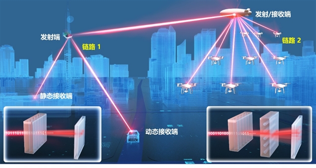 目前在旋翼无人机、小型车辆和舰艇等低空微小平台间建立空间激光通信组网仍存在重要挑战:其一,核心器件层面,为克服随机大气信道对激光光束畸变的影响,空间激光通信系统需要配备复杂的光学收发与光束控制结构,导致微小平台难以承载;其二,传输方法层面,空间激光通信通常为点对点的工作模式,对于节点数为N的空间网络,为实现任意节点间的激光互传,每个节点需要搭载N-1个独立的激光通信终端,严重限制了空间节点数量。
