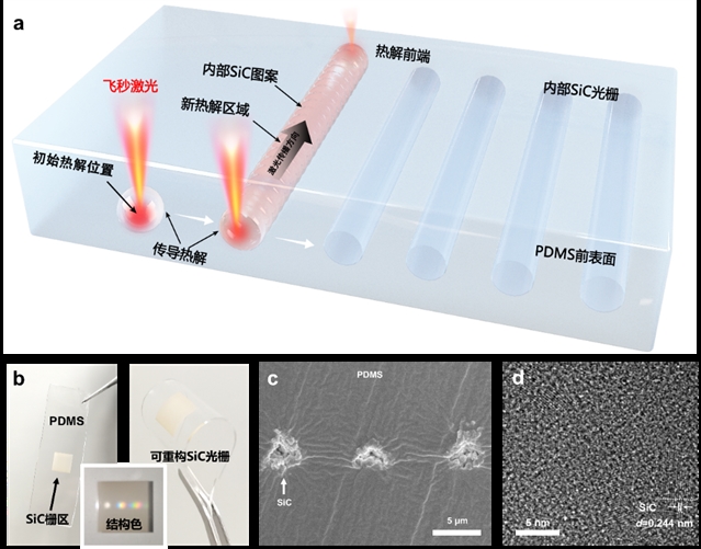 图2. 可重构SiC光栅制备原理与表征(a)飞秒激光与PDMS作用原理(b)可重构SiC光栅实物(c)内部SiC栅线(d)SiC的TEM照片。