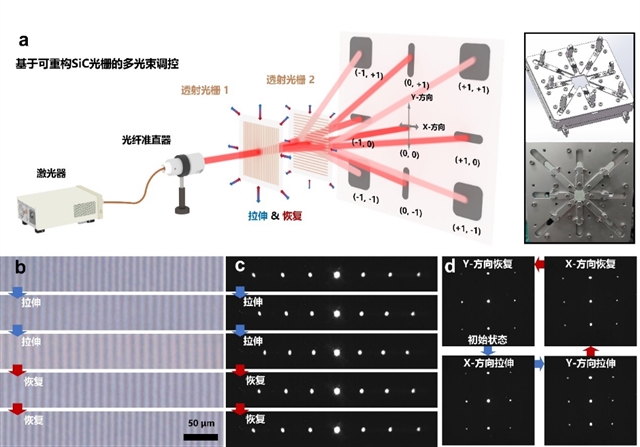 动态调控过程中高阶衍射光束通常会出现光束质量劣化,这主要是由可重构SiC光栅在应力驱动下的结构畸变造成的,团队通过设计方向同步拉伸方法及装置(图3a右),取代常规两侧拉伸机制,改善了薄膜的中心凹陷。调控过程中光栅的栅区呈现均匀形变(图3b),从而实现多光束的一维和二维偏转(图3c、d)。