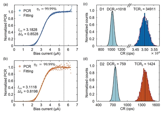 图2:展示了级联探测器的片上单光子探测效率测试结果。(a)图与(b)图分别显示了D1和D2的光子计数随偏置电流的变化曲线,明显可见计数趋于饱和,这表明纳米线的本征量子效率接近100%。(c)图与(d)图则分别为D1和D2探测器的计数率统计直方图(TCR为总计数率,DCR为暗计数率,两者差为光子计数率)。由于D2位于D1之后,主要吸收并探测D1未能探测的光子,因此其计数率显著低于D1。通过计算两者的比例,进一步分析可得,单个探测器的效率为97.81%,而级联探测的联合探测效率高达99.73%