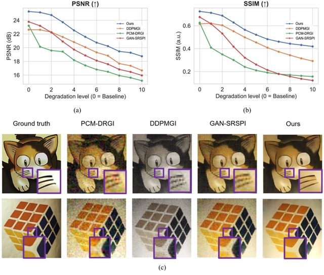 图2:实验验证与对比结果。(a) 不同神经网络在复杂退化条件下的重建图像峰值信噪比(PSNR);(b) 不同神经网络在复杂退化条件下的重建图像结构相似性指数(SSIM)。对比方法包括:DDPMGI,一种基于扩散模型的方法;PCM-DRGI,一种基于双分支卷积神经网络的方法;GAN-SRSPI,一种基于生成对抗网络的方法。(c) 复杂退化条件下的彩色实物成像对比