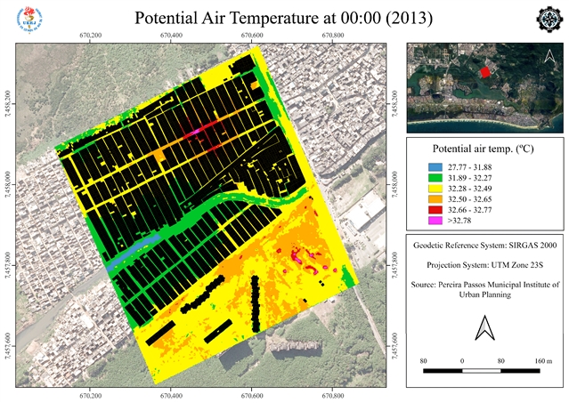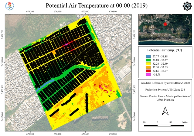 微气候模拟的结果聚焦于三个周期午夜观测到的潜在气温,模型显示多年间空间空气温度模式保持一致,日落后数小时内热岛现象显著持续存在。这种行为可能与建筑材料的热量保持有关,这些材料会随着时间缓慢释放热量,同时缺乏绿地和建筑间距,从而促成城市热岛的形成。总体来看,三次模拟一致显示研究区北部存在明显强烈的热岛效应,河岸温度较低,但在废弃的 Delfim 建筑附近的开阔地带则不然。