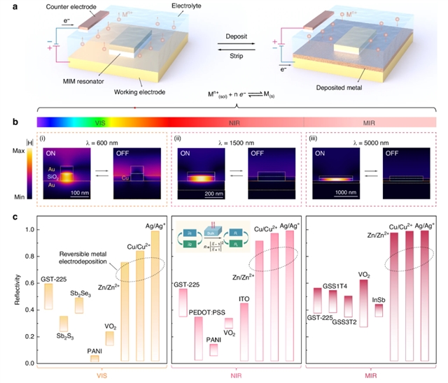 研究人员首先揭示了RME调控浸没在电解质中的MIM谐振器的工作机制(图1a)。向工作电极施加负偏压时,高反射率的金属层会沉积在谐振器周围区域,有效阻止入射光进入谐振腔,进而关闭其等离子体共振效应。当反转偏压极性时,可使沉积的金属层溶解为金属离子,并扩散至电解质中,使谐振器的谐振特性完全恢复。通过精准调整谐振器的尺寸参数,调控范围可从可见光波段延伸至中红外波段(图1b)。