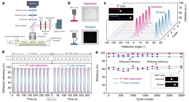 为进一步表征光束控制性能,研究人员搭建了一套显微镜系统(图3a)。通过数值孔径较小(NA=0.3)的物镜,能够清晰观察到超表面在沉积和剥离状态下的外观差异(图3b)。前五次循环的反射光束强度轮廓(图3c)显示,光可被有效调控至不同方向。沉积与剥离状态下的零级、一级衍射效率测试表明,器件在600次循环内稳定保持超90%的衍射效率(图3d)。进一步的异位循环测试显示,经过3000次循环后,器件仍维持约60%的反射效率与90%的衍射效率,整体性能无衰减(图3e)。