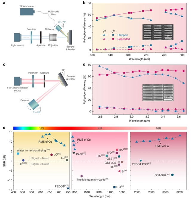 为探索器件在宽波段的应用潜力,研究人员采用定制角分辨光谱系统,对可见光与近红外波段的异常反射光特性进行表征(图4a)。结果显示,在610-710 nm波长范围内,器件沉积与剥离状态下均保持卓越光学性能(衍射效率≈90%,反射效率≈60%)(图 4b)。在中红外波段,通过红外椭圆偏振仪测试(图 4c)发现,2.6- 3.6 μm波长范围内的反射效率稳定在60%左右,推测衍射效率同样处于较高水平(图4d)。与其他有源材料系统相比,基于RME的超表面在可见光至中红外波段均表现出更高的信噪比(图 4e),充分彰显其宽波段应用优势。