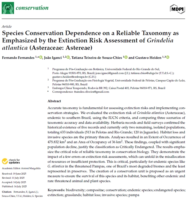 从Grindelia atlantica (Asteraceae: Astereae)灭绝风险评估看:物种保护高度依赖可靠的分类体系