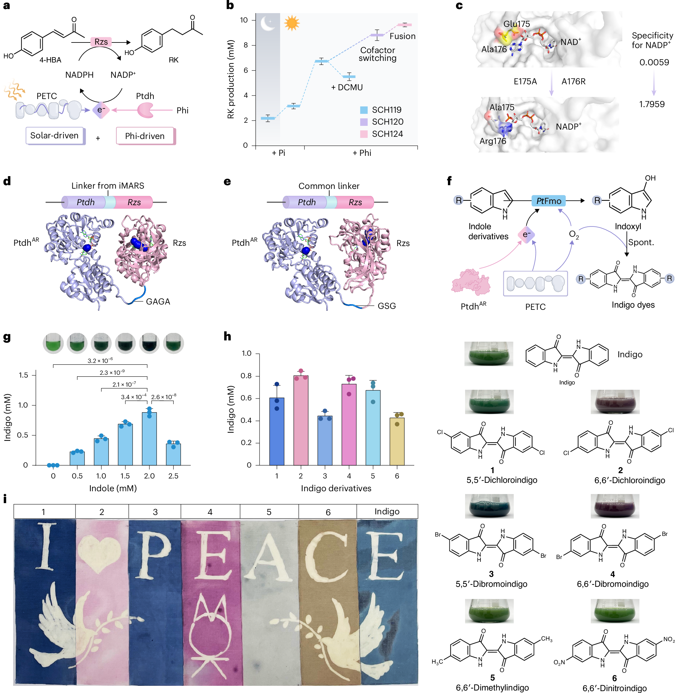 在通过SCHB催化获得还原性产物覆盆子酮的过程中,通过引入亚磷酸盐提供的额外电子,结合辅因子工程改造和基于人工多酶复合体理性设计工具iMARS的多酶空间邻近性优化,产量达9.64 mM,催化效率相比纯光驱动过程提升305%。此外,利用光合作用原位释放的氧气,研究人员还成功将SCHB系统应用于需氧的靛蓝及皇家紫等多种靛蓝衍生物的合成,收获的菌体沉淀可直接作为生物染料用于织物印染,避免了传统提取过程的高能耗与高污染。