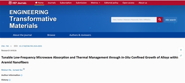 Mukun He, Junwei Gu. Tunable Low-Frequency Microwave Absorption and Thermal Management throughIn-SituConfined Growth of Alloys within Aramid Nanofibers.ENGINEERING Transformative Materials, 2026, 10.2738/ENGTM.2026.0001.