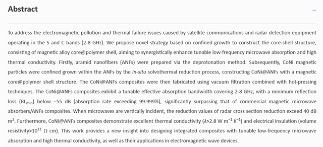 卫星通信与雷达探测等关键设备对全球信息交互做出了卓越贡献,其核心工作频段在低频区域S波段(2~4 GHz)和C波段(4~8 GHz),由此产生的电磁波污染对人类健康、军事安全和高精密电子设备的稳定运行构成严重威胁。微波吸收材料(MAMs)能有效降低雷达散射截面(RCS),成为解决电磁污染问题的关键材料之一。此外,MAMs在将入射电磁波转化为热能耗散的同时,设备运行过程中产生的显著焦耳热会导致局部热积聚,进而引发性能衰减甚至热失效。为解决上述问题,近日,西北工业大学顾军渭教授团队提出了基于限域生长构筑磁性合金核@高分子壳的核壳结构新策略,开发了兼具可调谐低频吸波性能与优异导热性能的复合材料,能高效应对其电磁污染与热失效协同挑战。