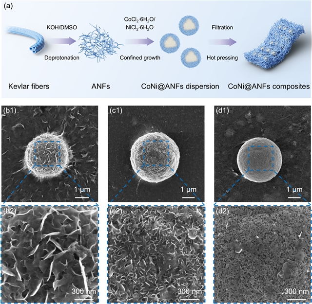 研究团队采用去质子化法制备了芳纶纳米纤维(ANFs),通过原位溶剂热还原法在ANFs孔隙中限域生长CoNi磁性颗粒构筑具有磁性核@高分子壳结构的CoNi@ANFs,再采用真空抽滤结合热压工艺制备CoNi@ANFs复合材料。