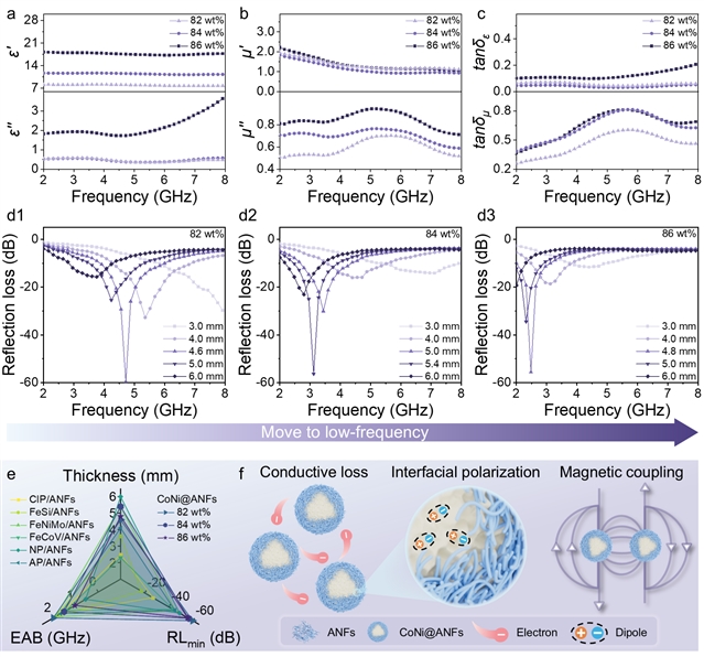 相比之下,在ANFs中原位合成磁性颗粒可有效抑制颗粒间因高表面能与磁耦合作用导致的团聚倾向,显著改善其分散均匀性。随着CoNi相对用量的增加,CoNi@ANFs复合材料的介电常数逐渐升高,磁导率虚部(μ′′)曲线上的自然共振峰向低频移动,反射损耗(RL)和有效吸收带宽(EAB)亦向低频迁移,阻抗匹配特性同步优化。良好的阻抗匹配特性可以实现电磁波畅通无阻地进入其内部,再通过以磁损耗为主导的多重损耗机制高效衰减,赋予CoNi@ANFs复合材料可调谐的低频吸波性能。