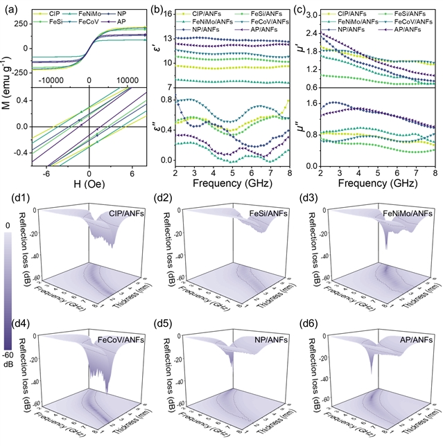 研究团队选取羰基铁(CIP)、铁硅合金(FeSi)、钼坡莫合金(FeNiMo)、铁钴钒合金(FeCoV)、纳米晶软磁合金(NP)以及非晶软磁合金(AP)六种常见的商用磁性吸波剂作为对照样品,分别与ANFs直接共混制备商用磁性吸波剂/ANFs复合材料。结果表明,高填充量下,磁性吸波剂固有高表面能及磁耦合相互作用易导致填料在聚合物基体中发生严重团聚,引发显著的阻抗失配,进而严重削弱对入射电磁波的吸收能力。