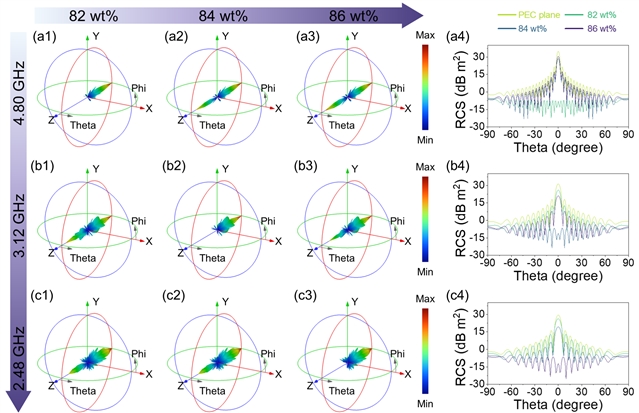 与理想电导体(PEC)相比,CoNi@ANFs复合材料在4.80 GHz、3.12 GHz和2.48 GHz频率下均显著抑制了电磁波散射,表现出极低的散射信号,其RCS减小值超过40 dB m2,进一步证实了CoNi@ANFs复合材料对低频电磁波具有可调谐的吸收损耗能力。