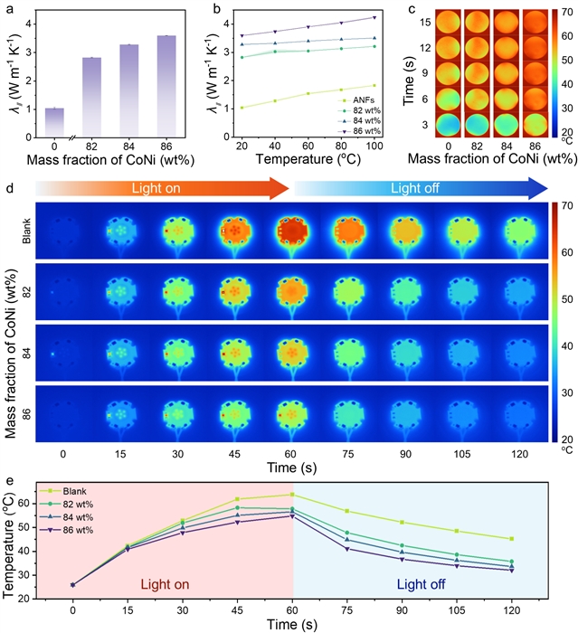 图6 CoNi@ANFs复合材料热管理能力: (a)导热系数, (b)不同温度工况下的导热系数, (c)红外热成像照片, (d-e)LCD灯加热和冷却过程和温度-时间变化曲线.