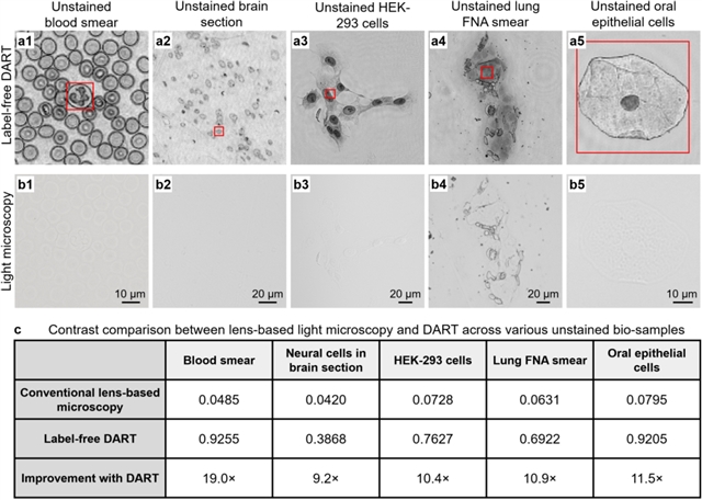 图3:(a1-a5) DART对不同无标记生物样本的高对比度成像;(b1-b5) 传统20x、0.75数值孔径物镜成像结果;(c) 定量对比分析显示DART在所有样本中均实现9.2倍至19.0倍的对比度提升