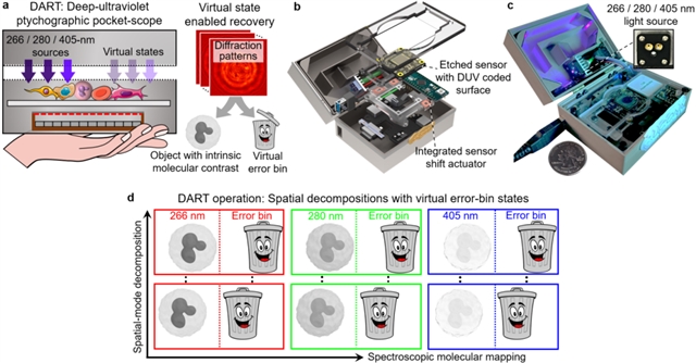 图1: (a) DART集成三波长光源(266/280/405 nm)的无透镜编码叠层成像系统,通过虚拟态算法分离系统误差,实现高保真分子成像;(b) 系统内部结构,展示改造后的深紫外传感器、编码表面,以及借鉴手机光学防抖技术的传感器位移执行机构;(c) 口袋大小的DART设备实物图;(d) 成像流程示意:编码传感器在磁力驱动下进行网格式位移,在每个位置采集衍射图样,通过叠层成像重建算法和虚拟态分离,最终实现三波长定量分子成像