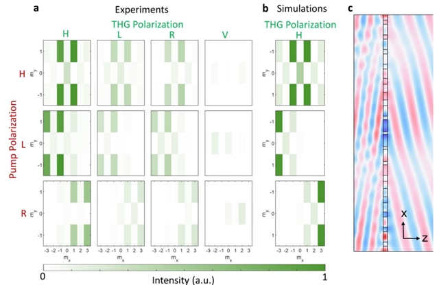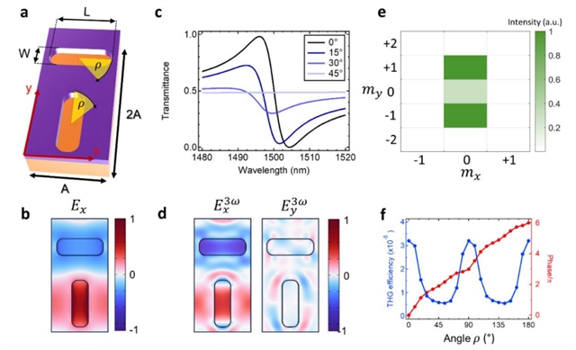 研究人员利用非晶硅薄膜制备超表面,通过孔径旋转编码相位信息,实现了可见光波段三次谐波的定向发射与偏振控制,既显著提升了非线性转换效率,又实现了对谐波波前的精准操控,突破了传统局域共振型超表面效率低、周期结构超表面波前调控受限的瓶颈,为非线性光学功能器件提供了新范式。