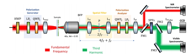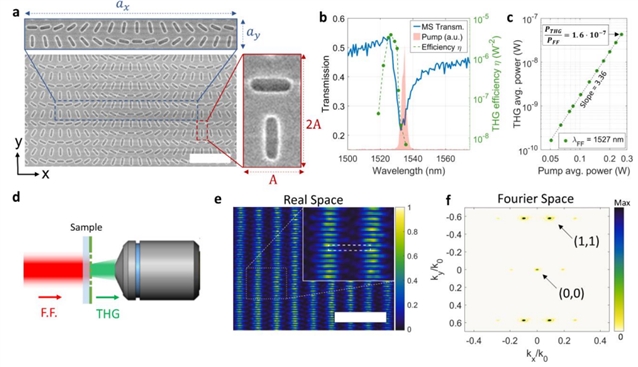 研究人员还优化了非线性超表面的制备与实验适配方案(见图3)。他们采用等离子体增强化学气相沉积制备非晶硅薄膜,结合电子束光刻与感应耦合等离子体刻蚀实现超表面图案化,通过抗电荷层旋涂解决电子束光刻充电问题;针对实验中三次谐波的高效采集,设计高数值孔径物镜结合傅里叶成像系统,捕捉到93%的三次谐波能量,并通过激光功率归一化与空间滤波减少信号波动。该方案为非晶硅、砷化镓等多种材料非线性超表面的制备与测试提供了可靠路径,尤其适配纳米级非线性光电器件的性能表征。