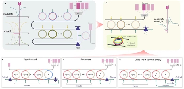 图1:基于调制与加权微环谐振器阵列的光子神经元工作原理。(a)典型的基于微环谐振器(MRR)的光子神经元结构,包括多波长激光器阵列、环形调制器阵列、基于 MRR 的权重阵列以及平衡型光电探测器。(c)本文提出的方案,将调制与加权功能统一集成于单一 MRR 阵列中,并采用单端光电探测器,从而显著降低系统复杂度与器件占用面积。(c–e)所提出 MRR 阵列的三种可配置工作模式,分别对应前馈神经元、短期记忆以及同时具有短期和长期记忆的组合模式