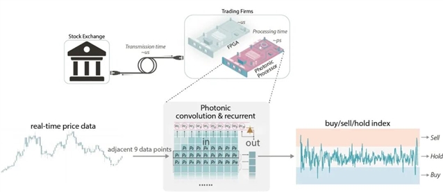 图2:光子高频交易处理器示意图。上方一行显示单个交易日内的股票价格走势。光子神经元可对连续的 10 个价格数据点进行处理,并生成用于“买入、卖出或持有”决策的指标