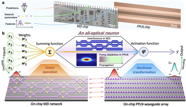 图1:全光神经元架构。(a) 基于干涉的线性处理芯片与铌酸锂非线性纳米波导的显微图像。电极用于设定网络参数,计算结果从光学输出端口读出。(b) 信息被编码到光信号中,首先通过干涉完成加权求和,随后进入 PPLN 波导,在材料的本征非线性作用下实现激活,从而在光域内完成一个神经元的完整计算