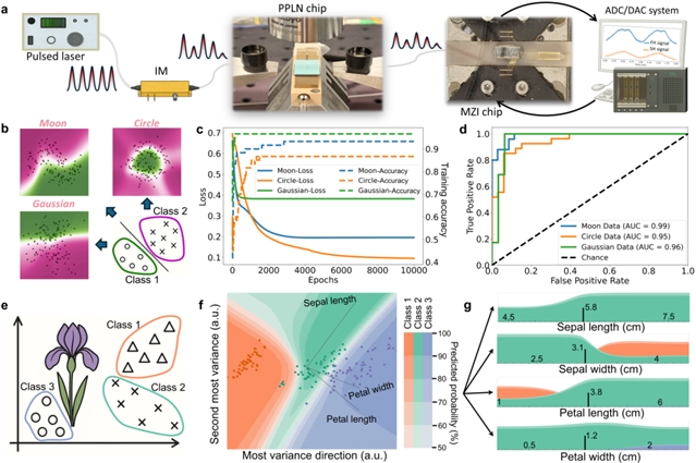 图3:利用全光神经元实现学习。(a) 非线性的 PPLN 芯片与可编程干涉处理器级联,构成一个可工作的光学神经元。信息被编码到光中,经过被动非线性变换与干涉计算后输出预测结果。(b)–(d) 在多种经典分类任务中,该系统能够学习复杂的决策边界,并取得 >95% 准确率。(e)–(g) 在多类别数据上,光学网络同样形成了清晰的类别分区,预测结果稳定且具有良好的可解释性