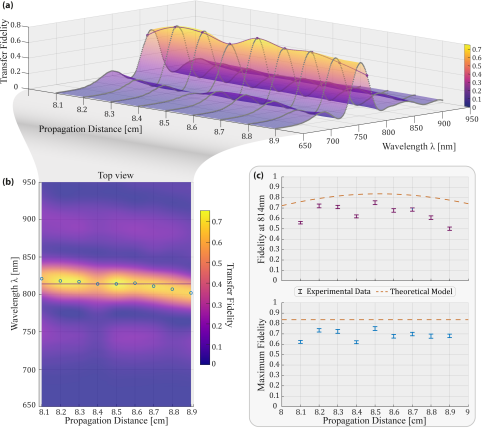 接着,团队进一步优化网络结构与传输机制(图2)。图2a 展示了九节点隐藏对称光子网络的具体布局,明确核心传输节点与单态节点的位置;图 2b 表明单态节点可实现无对称性破坏的任意扩展,为大规模量子网络构建提供新路径;图 2c 则呈现 “近乎完美量子态传输” 机制的数值模拟结果,显示随归一化传输距离增加,保真度呈现峰值递增趋势。这一机制借助相关理论并调控网络特征值,让传输保真度在有限时间内可无限接近1,避开传统 “完美态传输” 对网络参数的严苛要求,仅需满足两项与网络特性相关的条件,解决了传统近似传输保真度难控、完美传输实验难复现的问题。