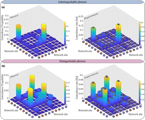 最后,研究人员进行了实验验证与方案优化(见图3和图4)。图 3 展示实验观测方案,通过调节传播距离和波长,精准捕捉保真度峰值,观测到首个峰值保真度 75%,还能通过波长调节控制传输过程;图 4 通过双光子反对称激发实验,观测到单态节点处量子干涉受抑制、核心节点定向传输的现象,验证量子干涉在网络中得以保留。这些实验方案解决了传统光子网络实验中量子态难调控、传输过程难观测的问题,为隐藏对称网络的本质提供直接实验证据。