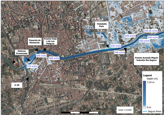 建模结果显示,塞古拉河各城市段的实际泄洪能力远低于官方估计值。在穆尔西亚段,河道中心区最大容量为400 m³/s,而入城和出城段的溢流阈值仅为210-235 m³/s。奥里韦拉段的情况更为严峻,矩形渠化段容量降至200 m³/s,而在城市中心狭窄处,溢流阈值进一步降低至138-140 m³/s,与官方估计的450 m³/s存在显著差距。阿尔莫拉迪段弯道狭窄处的容量为140 m³/s,而罗哈莱斯的卡洛斯三世桥由于桥墩结构限制,最大通过能力仅为200 m³/s。