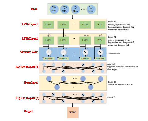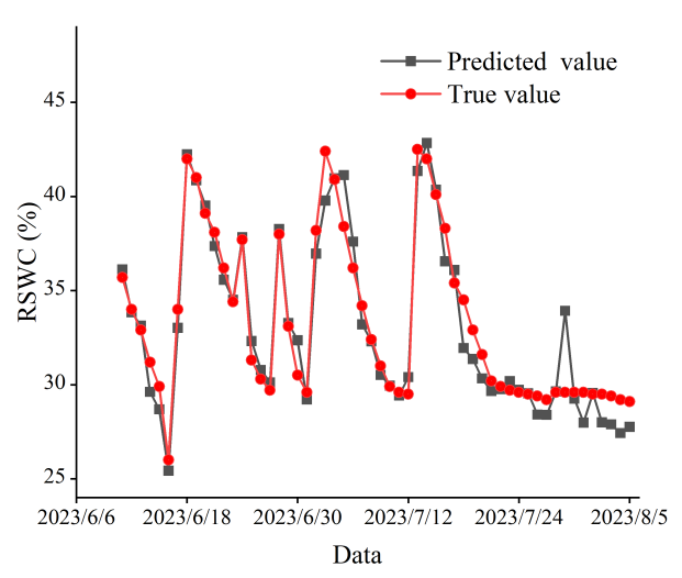 作者以猕猴桃果园为研究对象,针对单一植被指数因冠层光谱饱和导致土壤水分反演精度低的问题,构建了融合无人机多光谱数据与气象数据的ATT-LSTM深度学习模型。在数据层面,研究同步采集了猕猴桃冠层四个波段的光谱反射率及气温、湿度、辐射、灌溉量等气象参数,通过严格的时间配准确保了1440组多源数据的时序一致性。经双相关系分析筛选出9个与根区土壤水分显著相关的植被指数作为模型输入特征。在模型层面,作者构建了双层LSTM结合自注意力机制的ATT-LSTM网络(图1)。结果表明:融合气象数据后,LSTM模型测试集R²由0.723提升至0.855,RMSE由2.26%降至1.94%;而ATT-LSTM模型表现最优,测试集R²达0.868,RMSE进一步降至1.44%。时序分析显示,ATT-LSTM在短期精度和长期趋势捕捉上均优于标准LSTM(图2)。综上,多源数据融合有效克服了植被指数饱和问题,注意力机制增强了模型对关键时序特征的捕捉能力,为猕猴桃果园精准灌溉提供了技术支撑。未来需进一步整合作物生长模型以提升应用价值。