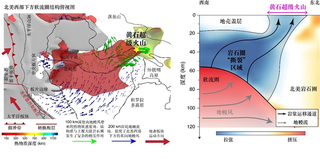 研究团队综合了大量北美西部的地质、地球物理和地球化学观测资料,对北美西部的岩石圈和对流地幔进行了高精度建模,并计算了相关的动力学过程,构建了完整的北美西部固体地球系统模型。模型预测,在黄石火山下方,快速向东漂移的软流圈(地幔风)穿过狭窄的大陆岩石圈通道时,上升的热物质与下潜的地幔流之间相互拉扯,导致减压熔融,产生大量幔源岩浆。