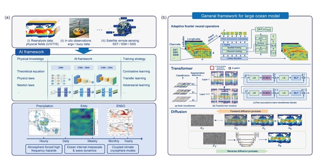 (a)通过整合多源数据,结合不同类型AI方法,实现跨时空尺度的海洋现象预测;(b)概括了海洋大模型预报的通用框架。