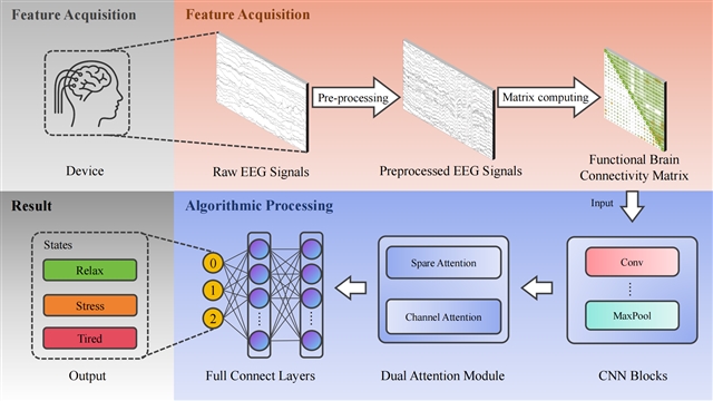 在无人机操作中,操作员的认知状态易因长时间任务而下降,导致反应迟缓、判断失误,威胁飞行安全。传统脑电图(EEG)评估方法受个体差异影响大,泛化能力有限。本研究创新性地将EEG信号转换为脑功能连接矩阵,以捕捉脑区间的协同活动,并结合DAM-CNN模型增强特征提取能力。DAM-CNN通过位置注意力模块(PAM)和通道注意力模块(CAM)动态聚焦关键神经特征,有效抑制冗余信息,从而提升分类精度。