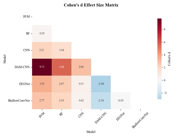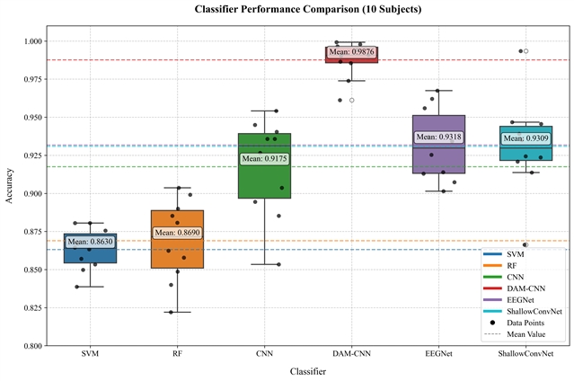 为验证提出的方法的效果,设置无人机操作模拟实验,实验涉及10名参与者,在三种认知状态(低、中、高负荷)下采集EEG数据,并通过留一主体交叉验证测试模型。结果表明,DAM-CNN的准确率较传统方法(如SVM、RF、EEGNet等)提升至少7.01%,方差降低至少0.0191,且在不同主体间表现稳定。该模型无需个体校准,即可实现实时认知状态识别,为动态人机协作提供了可靠技术支持。