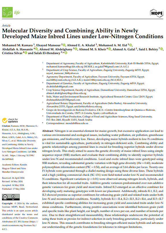 Kamara, M.M.; Mansour, E.; Khalaf, A.E.A.; Eid, M.A.M.; Hassanin, A.A.; Abdelghany, A.M.; Kheir, A.M.S.; Galal, A.A.; Behiry, S.I.; Silvar, C.; et al. Molecular Diversity and Combining Ability in Newly Developed Maize Inbred Lines under Low-Nitrogen Conditions.Life2024,14, 641.https://doi.org/10.3390/life14050641