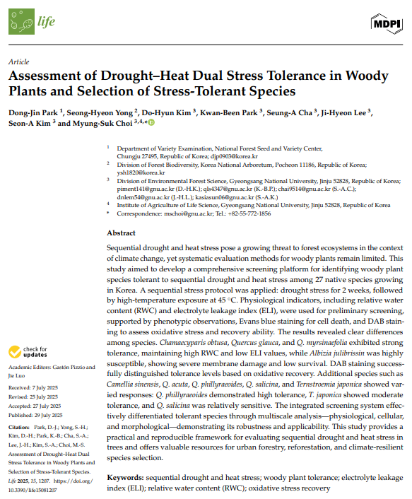 Park, D.-J.; Yong, S.-H.; Kim, D.-H.; Park, K.-B.; Cha, S.-A.; Lee, J.-H.; Kim, S.-A.; Choi, M.-S. Assessment of Drought–Heat Dual Stress Tolerance in Woody Plants and Selection of Stress-Tolerant Species.Life2025,15, 1207.https://doi.org/10.3390/life15081207