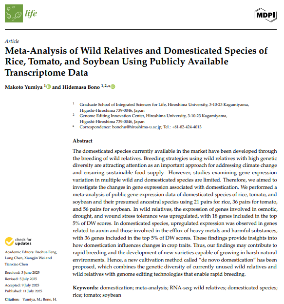 Yumiya, M.; Bono, H. Meta-Analysis of Wild Relatives and Domesticated Species of Rice, Tomato, and Soybean Using Publicly Available Transcriptome Data.Life2025,15, 1088.https://doi.org/10.3390/life15071088