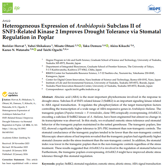 Horvat, B.; Shikakura, Y.; Ohtani, M.; Demura, T.; Kikuchi, A.; Watanabe, K.N.; Oguchi, T. Heterogeneous Expression of Arabidopsis Subclass II of SNF1-Related Kinase 2 Improves Drought Tolerance via Stomatal Regulation in Poplar.Life2024,14, 161.https://doi.org/10.3390/life14010161