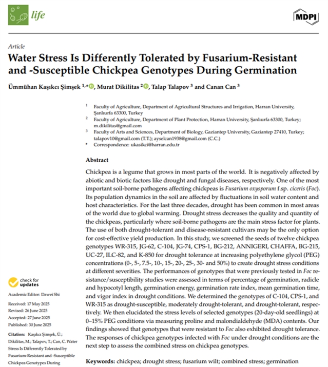 Kasikci Simsek, Ü.; Dikilitas, M.; Talapov, T.; Can, C. Water Stress Is Differently Tolerated by Fusarium-Resistant and -Susceptible Chickpea Genotypes During Germination.Life2025,15, 1050.https://doi.org/10.3390/life15071050