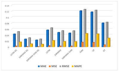 为验证上述方法的有效性,实验选取了PJM平台提供的DEO&K公司2022年4月1日至2025年4月1日的真实负荷数据。该数据集涵盖了美国俄亥俄州与肯塔基州的电力消耗场景,包含小时级负荷记录、调度率及天气特征,符合真实电网运行环境的多变量、高波动特性。在模型选择上,研究构建了三层对比体系:以LSTM代表深度时序建模方法,SARIMAX代表统计时序方法,SARIMAX+SVM代表统计与机器学习的混合策略。三类模型在时序依赖建模、非线性拟合能力与计算复杂度方面差异显著,能够全面评估所提方法对不同算法架构的适应性。为评估预测精度,采用MAE、MSE、RMSE及MAPE四项指标。实验基于三云并行架构,统一采用80/20的训练测试集划分,结合前80%数据训练、后20%数据验证的策略,验证偏差修正机制在实际负荷预测中的综合表现,结果如图2所示。