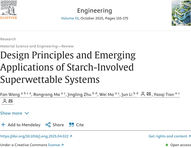 | Engineering最新综述提出淀粉基特殊润湿性系统的设计原则,助力先进功能材料的可持续发展 |