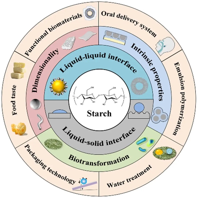 研究表明,虽然淀粉传统上主要应用于食品工业,但其独特的化学和结构特征在构建特殊润湿性表面方面蕴藏着巨大潜力。该综述创新地从本征特性(如亲水性、成膜性、粘附性和热分解性)、多维性(如胶体系统、0D颗粒、1D纤维、2D薄膜/纤维膜/涂层以及3D填料/多孔材料/食品质构)和生物转化性等3个层次架构了涉及淀粉的特殊润湿性系统的设计原则,并探讨其多样化的应用领域,范围涵盖生物医学材料、口服递送系统、乳液聚合、包装技术、食品口感调节以及水处理,且着重强调了智能系统的开发。