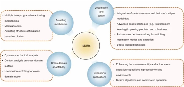 图3 从驱动机制、运动与控制、跨领域适应性和实际应用等方面探讨MUR面临的挑战和发展趋势