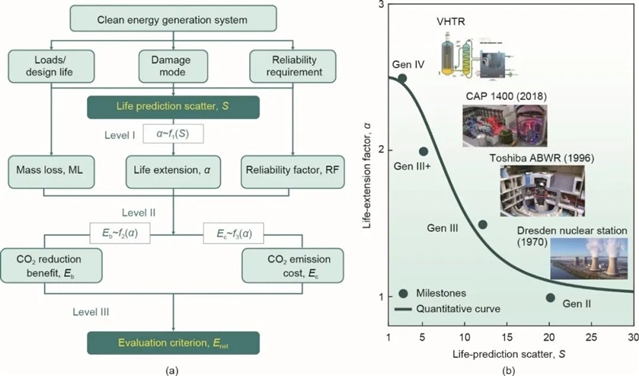 图 3. 清洁能源系统的减排效益:(a) 三级评价准则框架;(b) 以核能装置为例,延寿系数与寿命预测精度关系。
