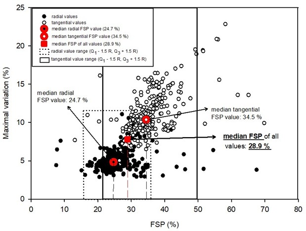 关于纤维饱和点的测定:研究采用了数学计算与图形分析相结合的方法。图1展示了通过数学计算获得的所有FSP值,包括径向和切向试样。结果显示,径向和切向的FSP均值存在较大差异,总体平均FSP为29.9%。由于数据存在一定离散性,研究进一步采用中位数进行分析以降低异常值影响。图2展示了剔除异常值后通过中位数计算获得的FSP值: