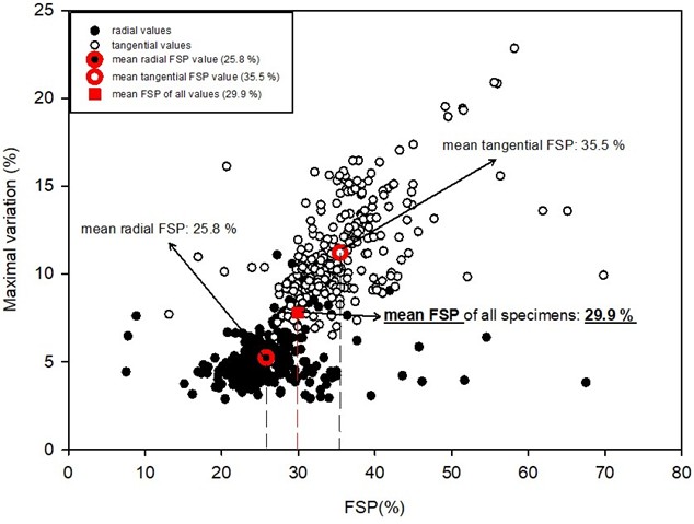 纤维饱和点的确定:FSP被一致地通过不同分析方法确定。数学计算得出的总体平均FSP为29.9%,中位数为28.9%,图形法利用二维数据分布重心所在直线的交点,得出FSP为30.8%。这一结果与“几位作者确定了所有木材的FSP通用平均值介于28%至30%之间”的理论值高度吻合。