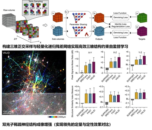 图1:VALID构建正交三维结构约束自监督学习,并在双光子稀疏神经结构成像增强上取得领先性能